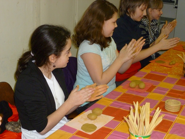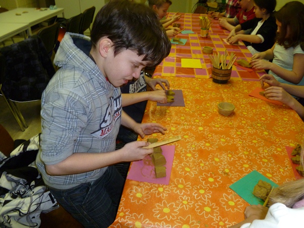 Danach wurde die Klasse in zwei Gruppen aufgeteilt. Die erste Gruppe töpferte eine Tonschale die sie anschließend mit nach Hause nehmen durfte. Die zweite Gruppe unternahm eine Führung durch die Ausstellung. Anschließend wechselten die Gruppen.