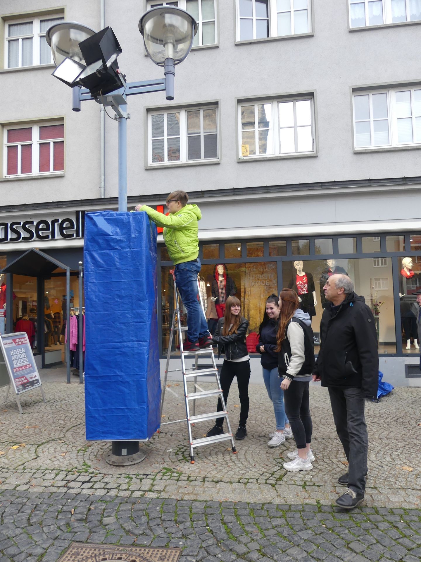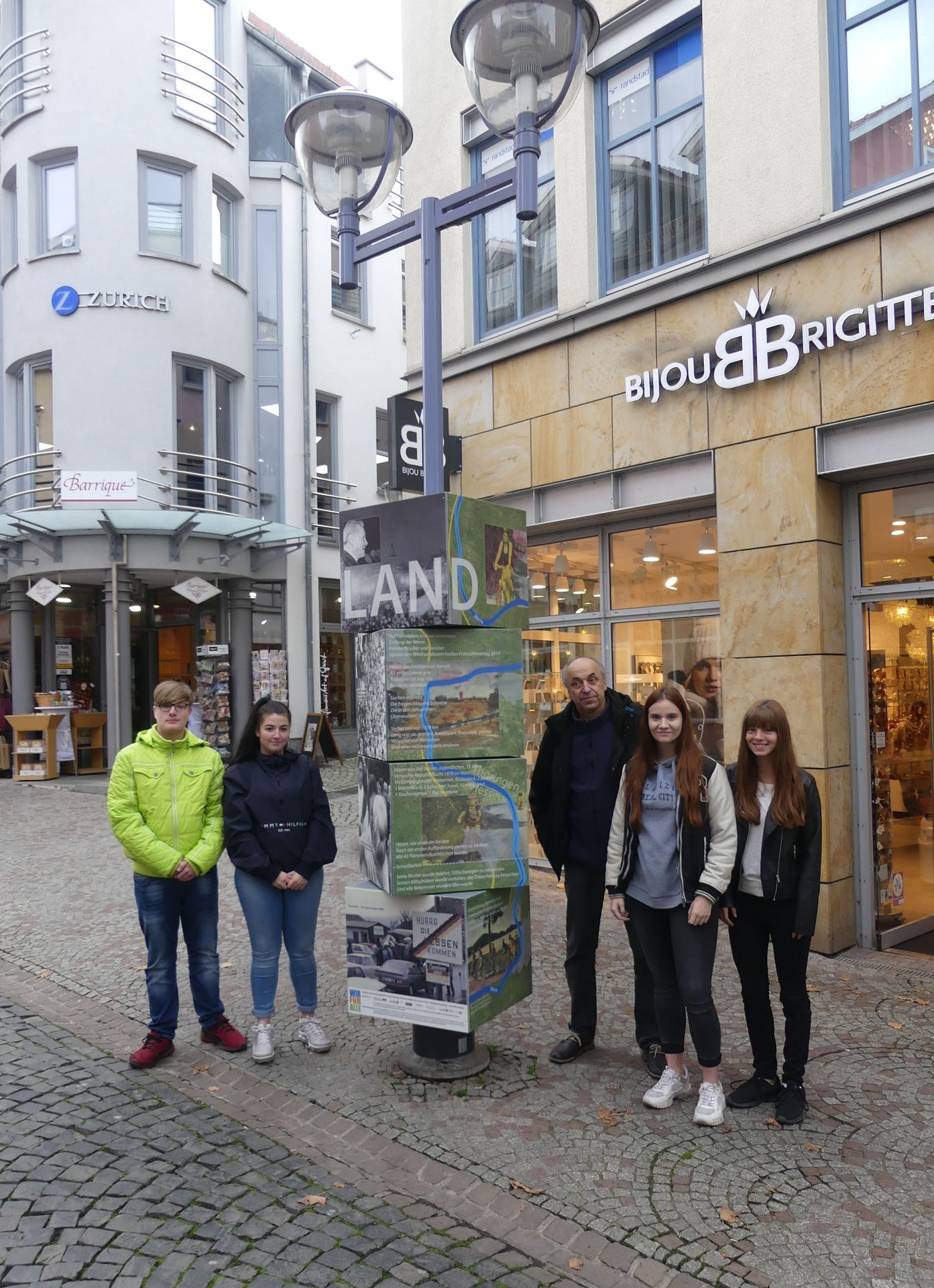 Wie bereits angekündigt, wurden am Mittwoch, dem 6. November, die vier Würfelsäulen des in der Überschrift genannten Projekts eingeweiht. Zusammen mit OB Knut Kreuch wurde die Ausstellung durch ihren Initiator, den Berliner Autoren und Journalisten Hans Ferenz, eröffnet. Der Aufbau war bereits einen Tag zuvor unter fleißiger Mithilfe von Schülern aus der 10e erfolgt. Bei der Entfernung der Hüllen halfen Paul, Angelina, Jessy und Amy aus der 10c. Die Säulen erinnern an die Wende in der DDR vor 30 Jahren und tragen - beginnend am Neumarkt Richtung Erfurter Straße - die Schwerpunktthemen Macht, Alltag, Aufbruch und Neuland. Zu sehen sind Bilder, man kann mit QR-Codes Zusatzinformationen erhalten und auch in eine Säule Einblick in frühere Zeiten nehmen. Viel Spaß beim Entdecken und Nachdenken!