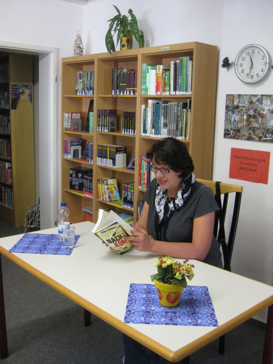 Am 04.10.2011 besuchte der Deutschkurs der Klasse 7a und 7b mit Frau Stein die Schulbibliothek. Dort erwartete uns Frau Brommer und die Stadtschreiberin von Gotha, Agnes Hammer. Diese stellte den Schülern ihr neues Buch „Nacht, komm!“ vor. Das Buch handelt von Lissy. Leider hat uns Frau Hammer nicht alles verraten, was mit Lissy passiert und lies sich auch nicht überreden, uns die Sexszene vorzulesen. Aber wir können dieses Buch nur empfehlen. Man kann es kaufen bzw. im Buchladen bestellen. Es kostet 12,95 €.