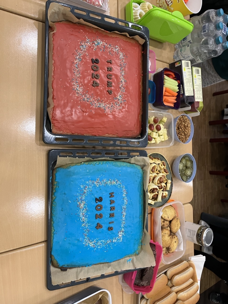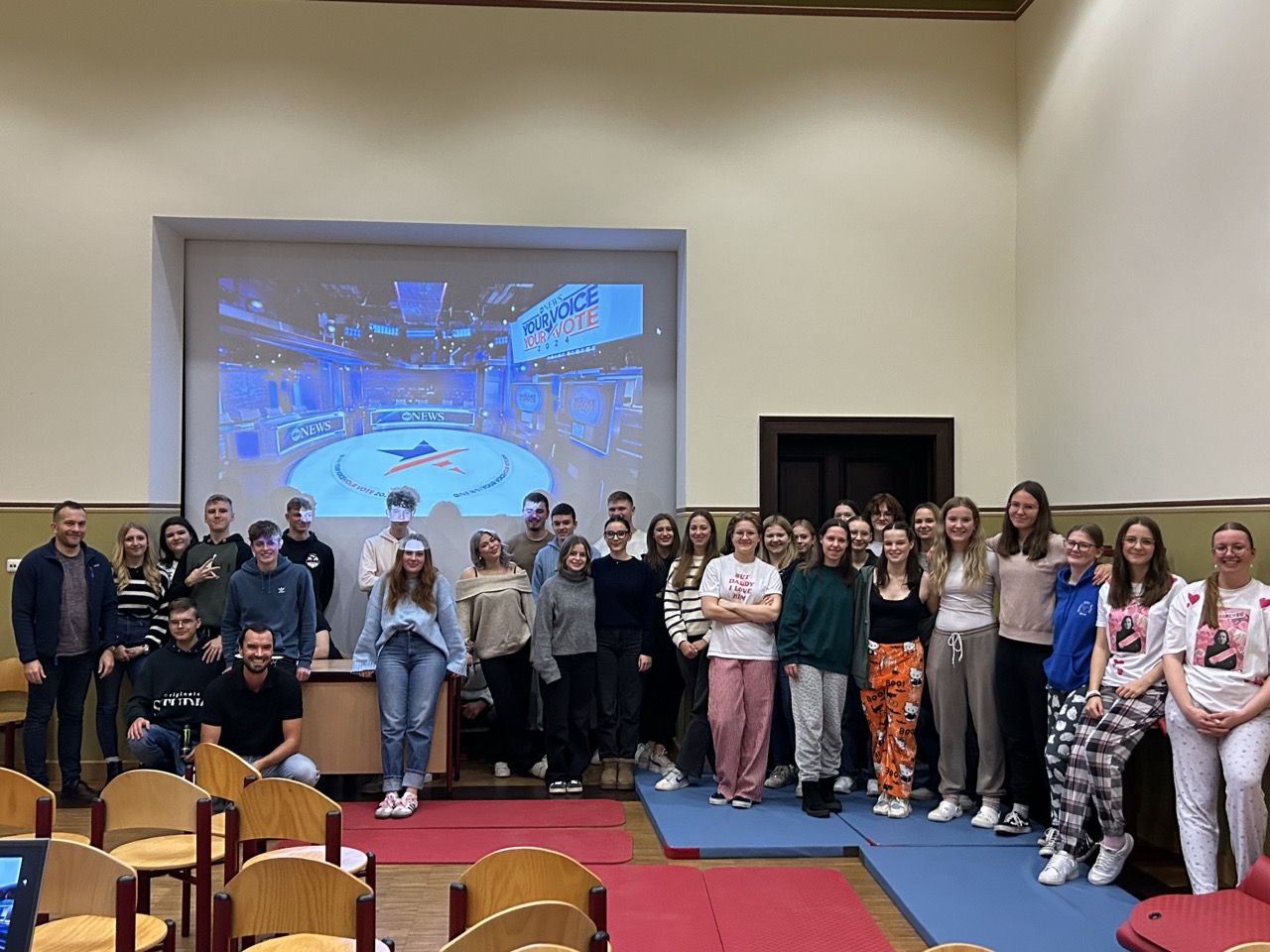 Nach dem Besuch des bekannten Journalisten in der Schule im Oktober und gründlicher Vorbereitung im Unterricht verfolgten 35 sehr interessierte Oberstufenschüler in der Aula ihrer Schule die Entwicklung in der Wahlnacht in den USA. Angeregt worden war die besondere freiwillige Veranstaltung durch die Sozialkundelehrer Sebastian Stephan und Lukas Glaß. Übernachtet werden konnte in der Schule. Dafür wurden die beiden Musikräume zu Schlafsälen umfunktioniert. Die Schüler organisierten ein gemeinsames amerikanisches Snack-Buffet, gestalteten Outfits passend zur Wahl, schauten Dokumentationen, spielten Spiele und verfolgten gespannt die Berichterstattung. Emma Hütter, Celina Seifert und Carolina Stoll waren sich einig: „Meine Hoffnung ist, dass Kamala Harris gewinnt.