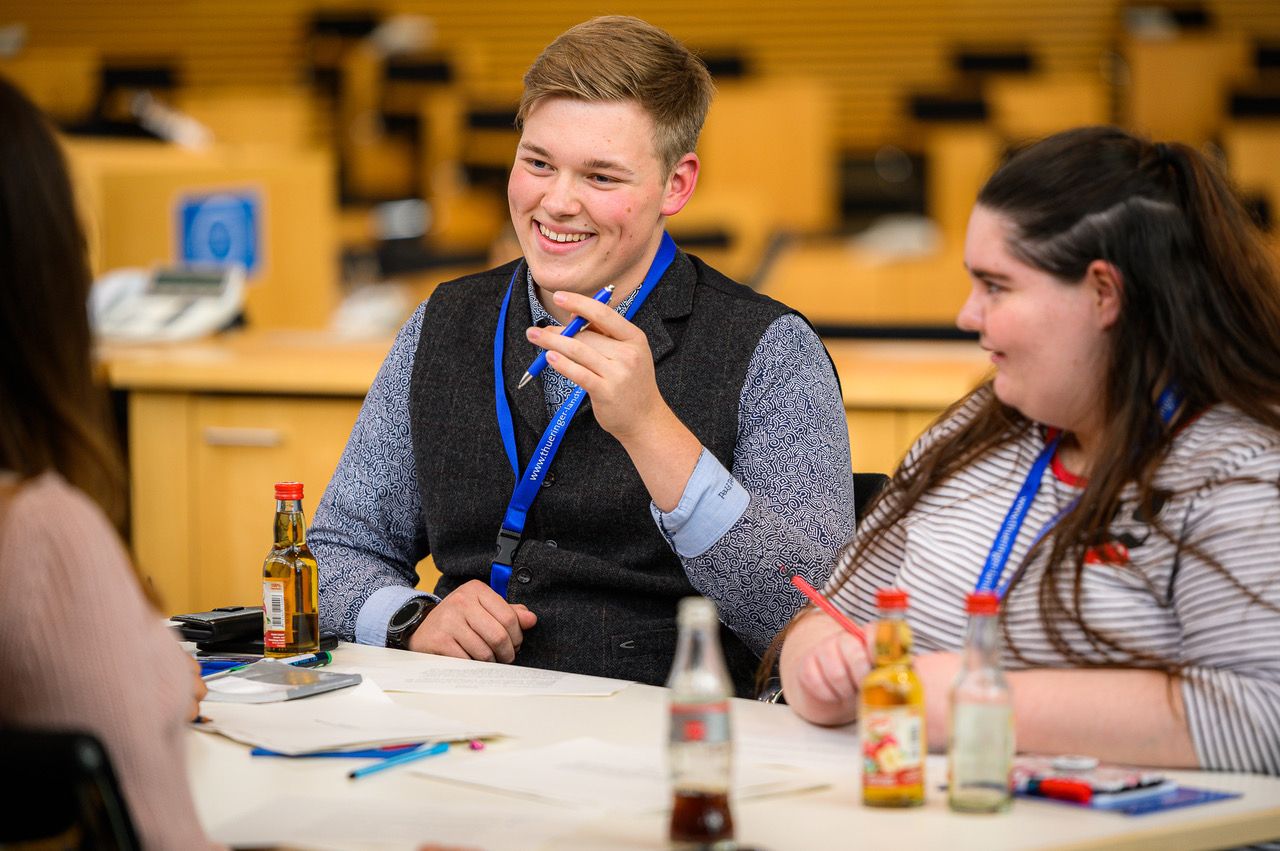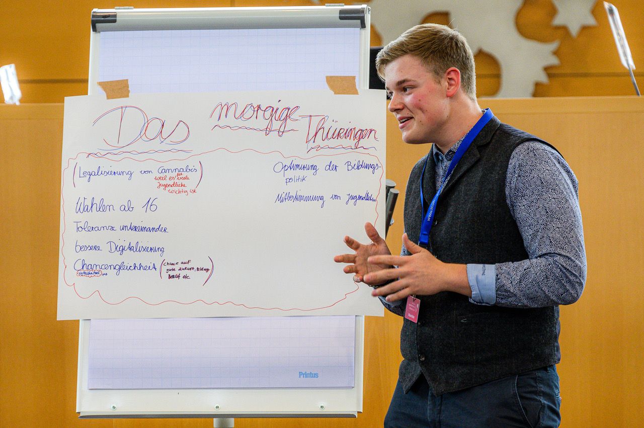 Höhepunkt war eine spannende Diskussion mit Landtagspräsidentin Birgit Keller zu Verfassungsfragen und Politikfeldern, die die Jugendlichen in ihrer Lebenswirklichkeit wiederfinden. Außerdem präsentierten sie der Präsidentin ihre bisherigen Workshop-Ergebnisse.