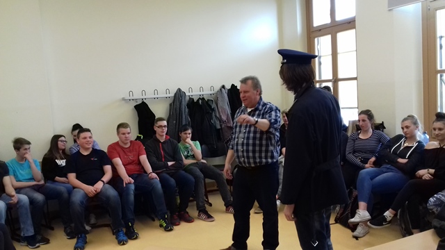 Besonders eindrucksvoll war für die Schüler auch die Anschaulichkeit des Vortrages. Originalutensilien wie eine Knebelfessel, ein Gummiknüppel oder Uniformteile ließen manches nacherlebbarer werden. „Eine Uniform gibt Macht.“, sagte Norbert Wagner. Jonas Schottmann, der in eine solche schlüpfte, bestätigte dieses Gefühl nach dem Rollenspiel eines Verhörs. „Macht verändert aber auch den Menschen.“, warnte der Zeitzeuge. „Es kommt auf die Menschen an, wie sie sich verhalten.“ Warum er seine Erfahrungen an Schulen weitergäbe, wollte Niklas Stötzer wissen.