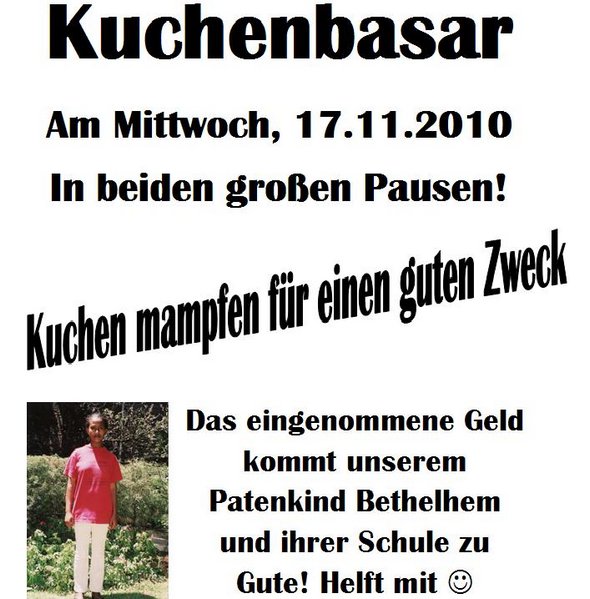 „Kuchen mampfen für einen guten Zweck“ - hieß es am Mittwoch, dem 17.11.2010. Chelsea Bessert, Stefanie Hannig, Melanie Meier und Lisa Zeihs organisierten zusammen mit den Schülern der Klasse 6d einen Kuchenbasar zu Gunsten unseres Patenkindes Bethelhem Wagari Terfa. Es wurden Plakate gebastelt, Kuchen gebacken, dieser wurde dann verkauft und zu guter Letzt wurde wieder Ordnung geschaffen, um Ärger mit den Hausmeistern aus dem Weg zu gehen. Diese haben die Aktion unterstützt und dafür einen Teller Kuchen als Dankeschön bekommen. Unterstützung kam außerdem von zahlreichen Schülern und Lehrern.