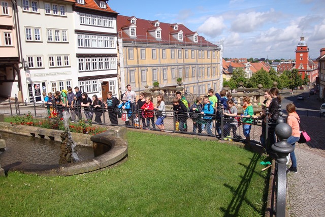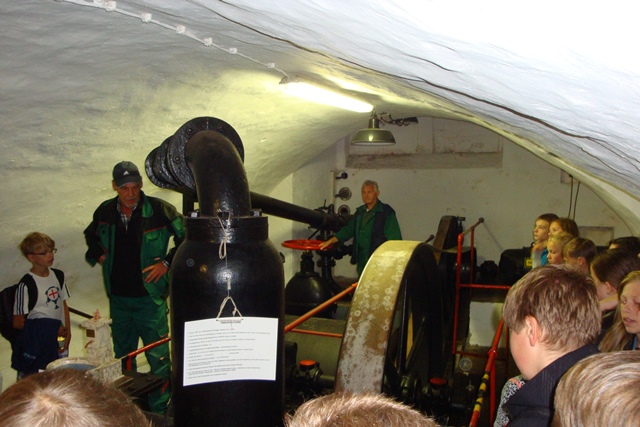 Erste Station war das Pumpenhaus am oberen Hauptmarkt, wo die Elftklässler selbst Wissenswertes über das Gewässer erzählten und Brunnenwart Guntram Streit sowie Gewässerwart Detlef Knobloch das technische Wunderwerk vorführten. Als die Pumpe zu Demonstrationszwecken angestellt wurde, waren die Kinder hellauf begeistert und stellten viele Fragen.