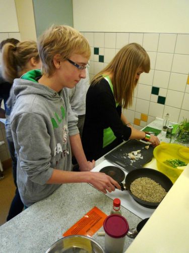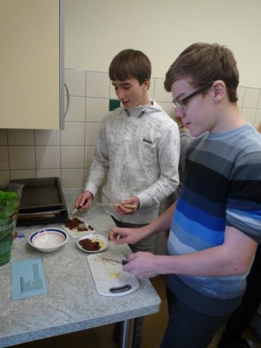 Am Freitag, den 7. Dezember 2012, war für die Schülerinnen und Schüler der 8d der Kooperativen Gesamtschule „Herzog Ernst“ in Gotha kein normaler Unterrichtstag. „Gesunde Ernährung“ war das Thema des Projekttages. Mit freundlicher Unterstützung von Frau Reingard Kneise, wurde die „Gesunde Ernährung“ unter die Lupe genommen. Die Mädchen und Jungen befassten sich die ersten Stunden mit der Ernährungspyramide. Welche Lebensmittel gesund sind, welche man in Maßen und welche man in Massen essen sollte. Im weiteren Verlauf des Projektes mit der Bezeichnung „Lila Kuh und Anti-Matsch-Tomate“ vom Thüringer Ökoherz, fanden sich alle in der schuleigenen Küche ein. Hier wurde mit viel Spaß und Freude Knäckebrot und andere gesund Leckerein gebacken. Der selbstgemachte Brotaufstrich, egal ob süß oder herzhaft, durfte natürlich nicht fehlen. Für die Klasse 8d war es ein sehr informativer Vormittag, wobei der ein oder andere gewisse Anregungen mit nach Hause genommen hat.