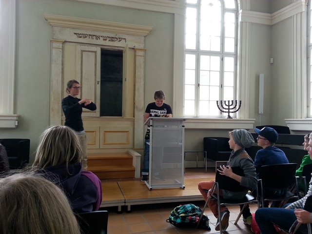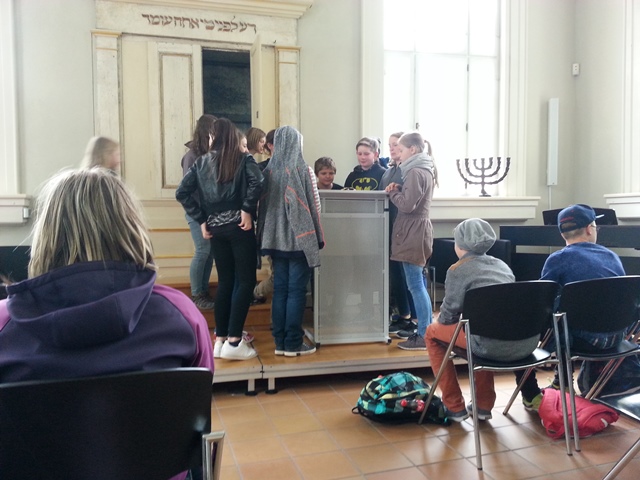 Zum Schluss sind wir zur kleinen Synagoge, dort haben wir weitere wissenswerte Dinge über das Judentum erfahren. Uns wurde dort von einer Expertin erklärt, wie der jüdische Gottesdienst abläuft und wir durften selbst ausprobieren, wie man aus einer Torarolle liest.