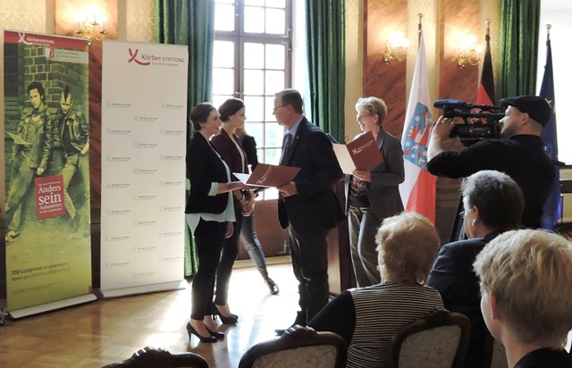 Eine tolle Ehrung erfuhren Leah Jeron und Emelie Kautz aus der Jahrgangsstufe 12 der KGS. Am Montag, dem 07. September 2015, erhielten sie aus der Hand des Thüringer Ministerpräsidenten Bodo Ramelow und der ehemaligen Volkskammerpräsidentin der DDR Sabine Bergmann-Pohl in den Räumen der Thüringer Staatskanzlei einen Förderpreis für ihren Beitrag zum Geschichtswettbewerb des Bundespräsidenten 2014/15 unter dem Motto "Anders sein. Außenseiter in der Geschichte". Die beiden jungen Frauen hatten sich mit dem Thema "Untersuchungen zur Umerziehung von sog. „Asozialen“ während der NS- Diktatur im Arbeitserziehungslager Breitenau unter Berücksichtigung der Akten von Gefangenen aus Gotha" beschäftigt.