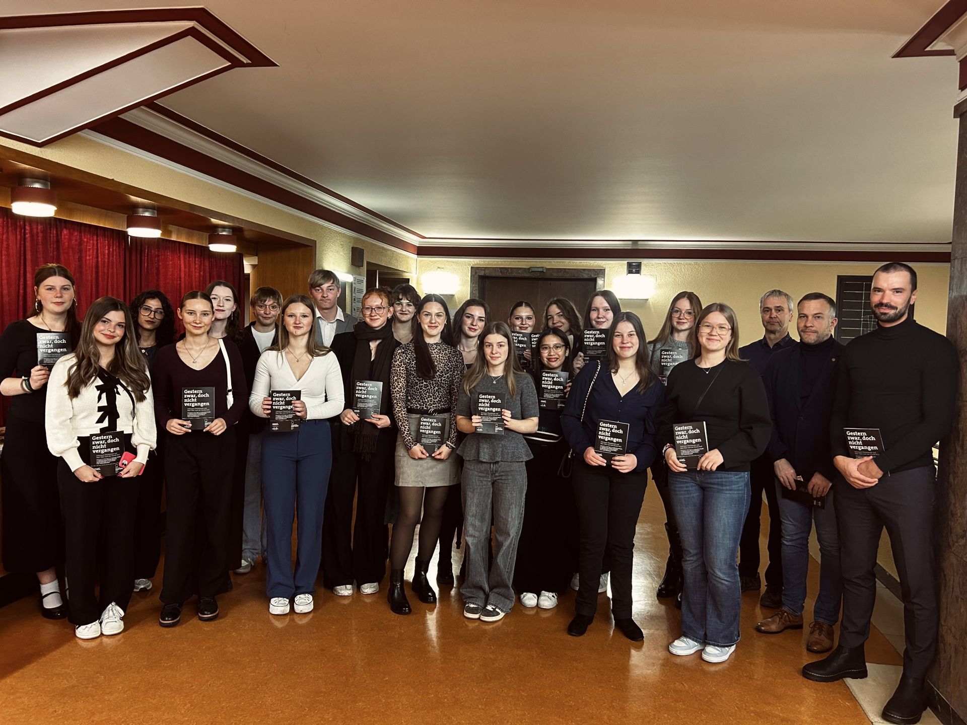 Dieses Zitat beschreibt eindringlich den Gedanken, mit dem sich Schülerinnen, Schüler, Lehrerinnen und Lehrer der Schule am 9. November 2025 auseinandersetzten. Gemeinsam erlebten sie die szenische Lesung „Gestern zwar, doch nicht vergangen“ von Alexander Pfeuffer, die im Kulturhaus stattfand. Zu der zentralen Gedenkveranstaltung der Stadt Gotha hatte Oberbürgermeister Knut Kreuch alle weiterführenden Gothaer Schulen eingeladen.
