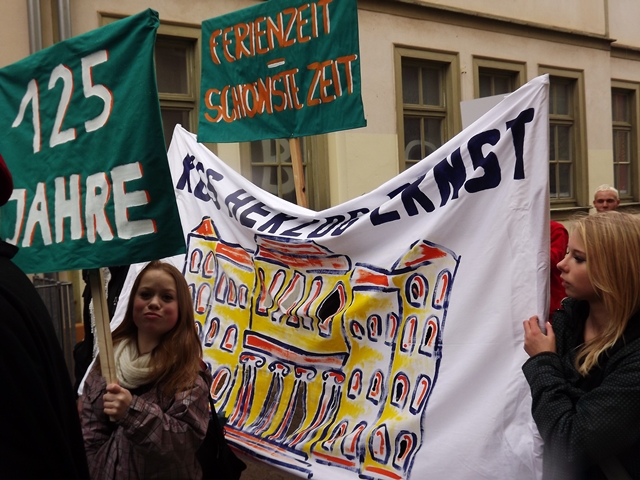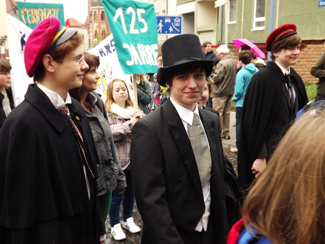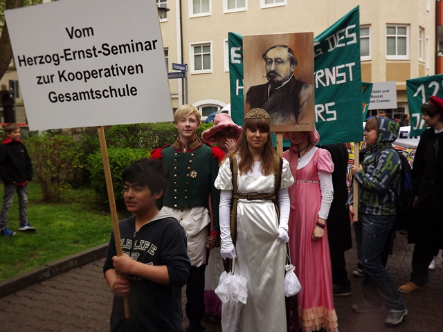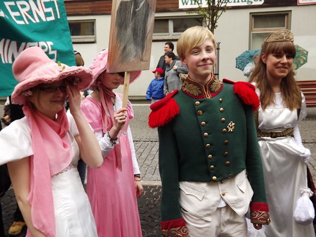 125 Jahre besteht unsere Schule nun schon. Das war auch das Thema für unser Bild beim Gothardusumzug. Der Herzog nebst Gemahlin, Zofen und Studenten gaben sich die Ehre. Ihnen wurde vom Gothaer Volk entsprechend gehuldigt. Irgendwie sieht unser Herzogpaar auch besser aus als die echte Vorlage. Dirk Becher