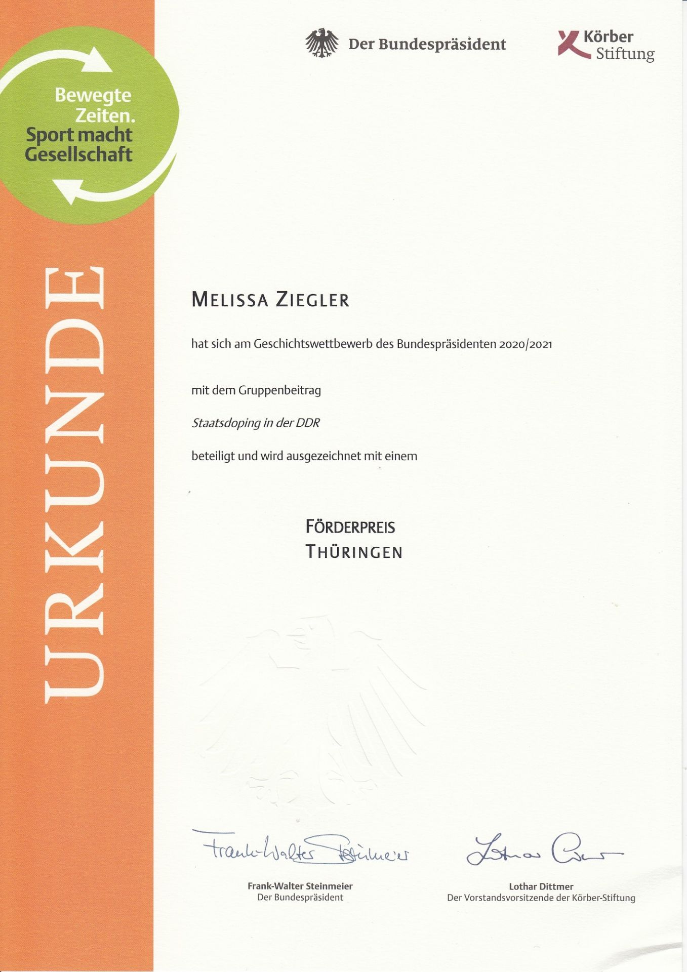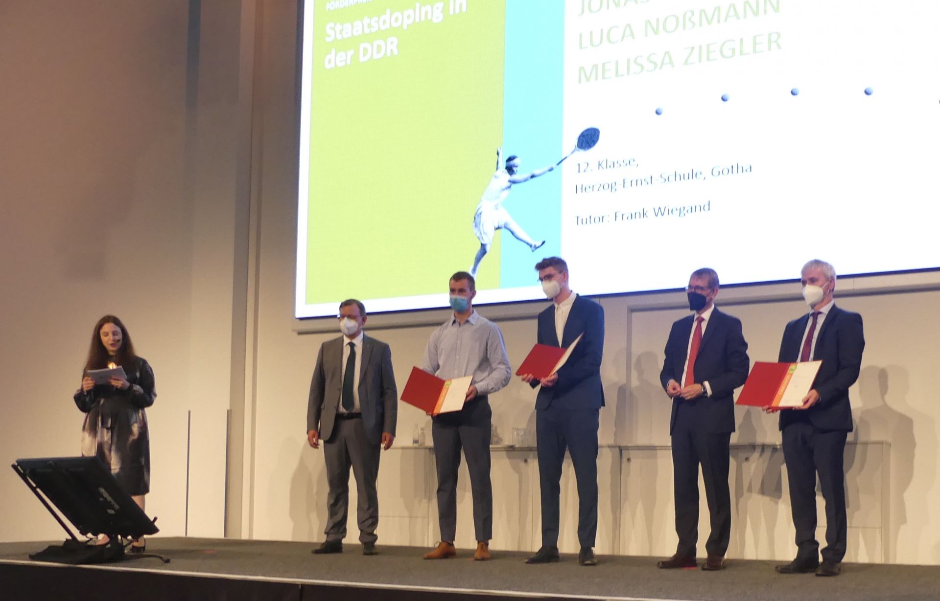 Für die Preisträger des Geschichtswettbewerbs des Bundespräsidenten hatten sich die Organisatoren der Körber-Stiftung bei der Preisverleihung am 8. September 2021 in der Kongresshalle des Erfurter Steigerwaldstadions neben dem Ort und der Person, die die Auszeichnung vornahm, etwas Besonderes einfallen lassen. Box-Weltmeister Dr. Wladimir Klitschko, Biathlon-Olympiasiegerin Andrea Henkel, Kugelstoß-Paralympics-Sieger Nico Kappel, die ehemalige Radsportlerin Kristina Vogel und andere namhafte Sportler gratulierten den Schülern per Videobotschaft. Zu den Ausgezeichneten gehörten mit Emma Reinhardt, Melissa Ziegler, Björn Kirchner, Luca Noßmann und Jonas Zajitz auch Abiturienten des Jahrgangs A21 unserer Schule. Sie hatten ihre überarbeitete Seminarfacharbeit „Doping in der DDR“ zu dem Schülerwettbewerb eingereicht und erhielten dafür einen Förderpreis. Stellvertretend für die Gruppe nahmen Björn und Luca ihre Urkunden aus den Händen des Thüringer Ministerpräsident Bodo Ramelow in Empfang. Herzlichen Glückwunsch zu der Leistung und zur tollen Auszeichnung auch von der Schulgemeinde der KGS!