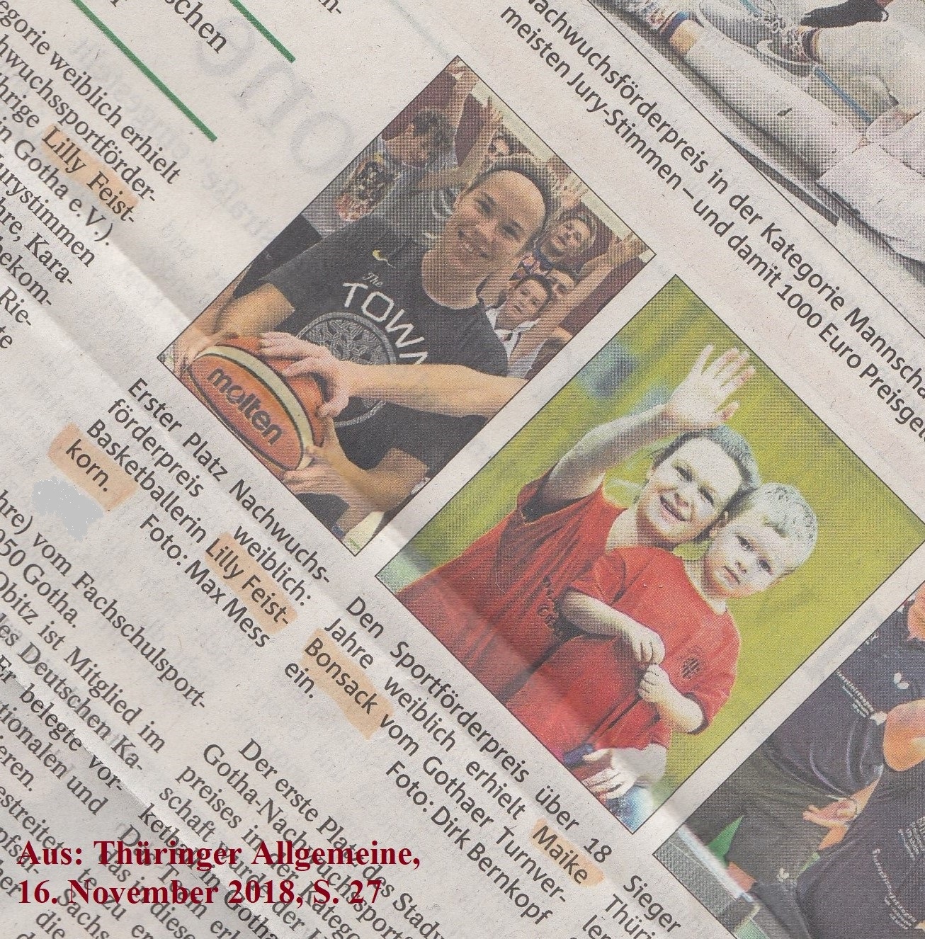 "Wer Zeitung liest, erfährt" auch viele schöne Dinge. So berichtete die Gothaer Tagespresse - siehe Bild - über die Verleihung der Sportförderpreise der Stadtverwaltung und der Stadtwerke-Sportstiftung für "die besten Gothaer Athleten und Mannschaften [...] 2018". Die Schulgemeinschaft der KGS gratuliert allen Preisträgern und ihren Vereinen, insbesondere unserer Schülerin und Basketballerin Lilly Feistkorn sowie unserer Lehrerin und Turnerin Maike Bonsack!