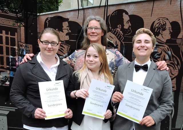 Als am Dienstag, dem 31. Mai 2015, in der Gedenkstätte Andreasstraße in Erfurt die besten Leistungen des 13. Schülerwettbewerbs der Stiftung Ettersberg „Diktaturerfahrung und demokratische Umbrüche in Deutschland und Europa“ geehrt wurden, wurde auch eine Gothaer Schülergruppe auf das Podium gerufen. Aileen Braun, Michael Darr, Theressa Keller und Rebecca Rebling von der Kooperativen Gesamtschule „Herzog Ernst“ hatten ihre überarbeitete Seminarfacharbeit „Rosa Leben in einem ‚grauen Versteck‘ – Untersuchungen zum Thema ‚Homosexualität in der DDR‘“ eingereicht. Der Vorsitzende der Jury, der Historiker Prof. Dr. Gunter Mai, lobte die Arbeit, in der trotz der schlechten Quellenlage eine fundierte Darstellung gelang. Die Thüringer Ministerin für Bildung, Jugend und Sport, Dr. Birgit Klaubert, hatte in ihrer Rede als Schirmherrin des diesjährigen Wettbewerbs auf den ersten Artikel des Grundgesetzes verwiesen: „Die Würde des Menschen ist unantastbar.“ Dieser Satz passte insbesondere auch auf die Seminarfacharbeit der Gothaer Schülergruppe, deren Leistung mit einem Sonderpreis gewürdigt wurde. Michael Darr konnte leider nicht an der besonderen Veranstaltung teilnehmen und fehlt deshalb auf dem Bild. Besonderer Dank der Schülergruppe gilt insbesondere dem Gothaer Außenbetreuer Frank Börner sowie dem Mitarbeiter des Landesbeauftragten des Freistaates Thüringen für die Aufarbeitung der SED-Diktatur Dr. Matthias Wanitschke für die vielfältige Unterstützung.