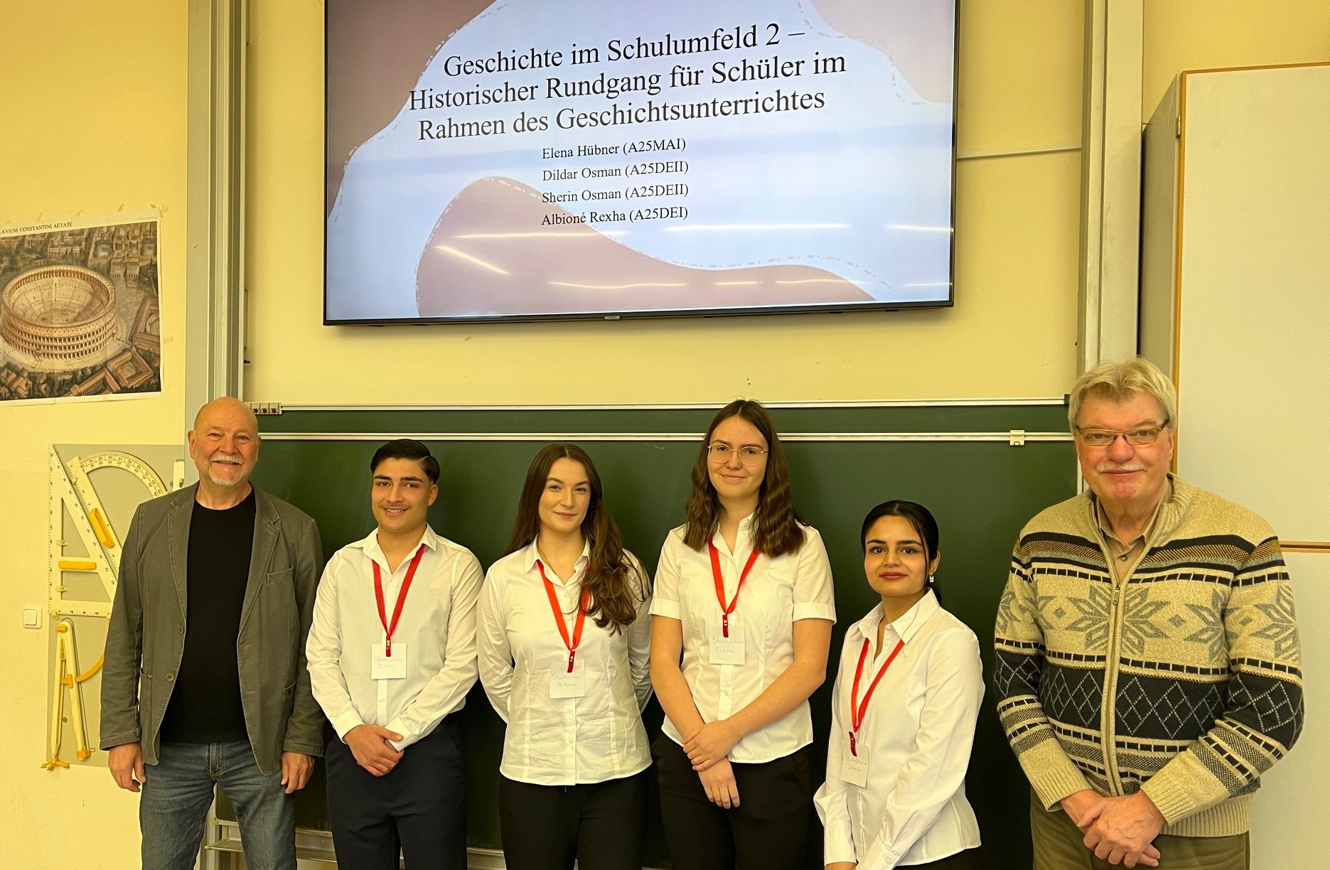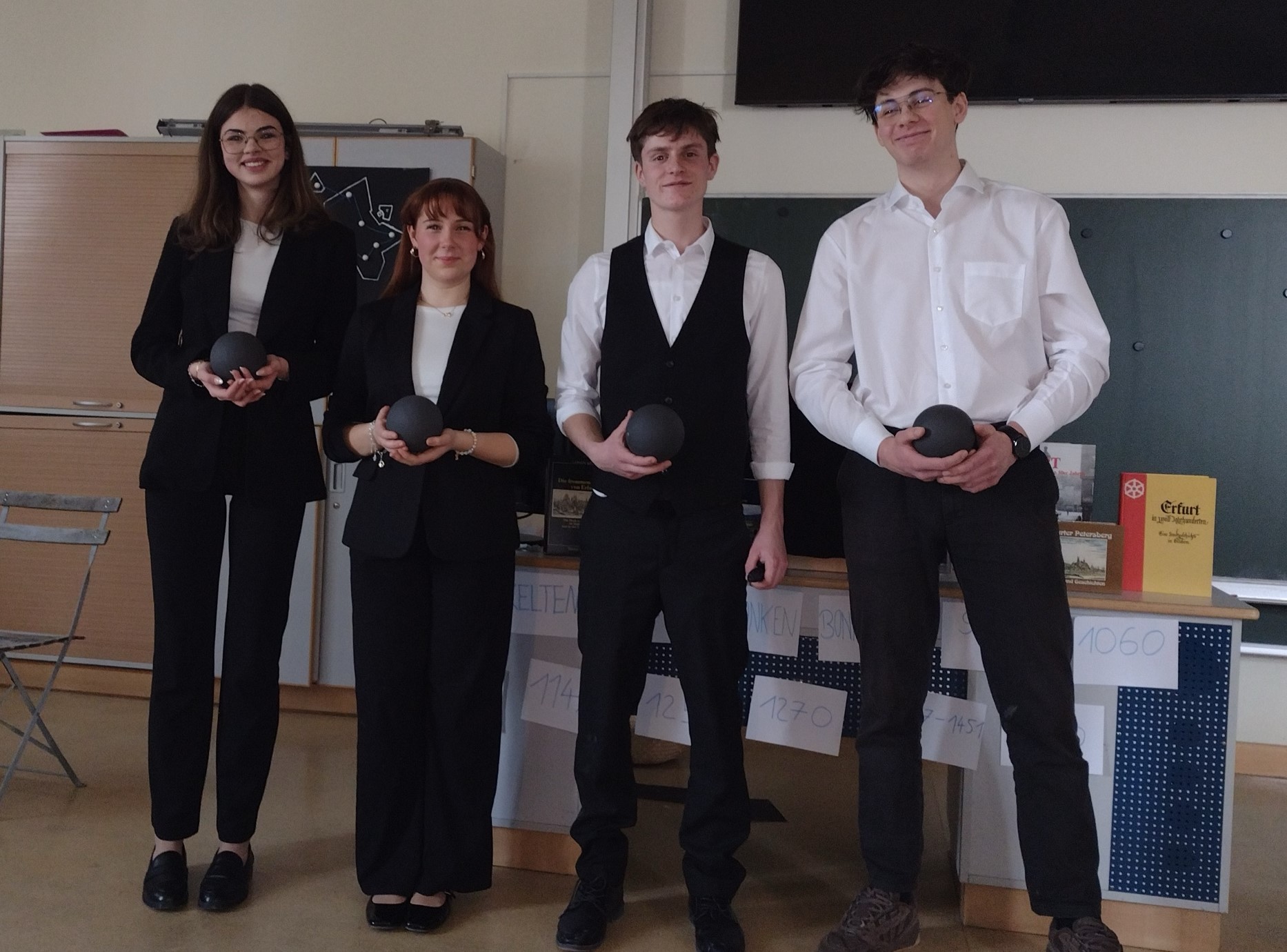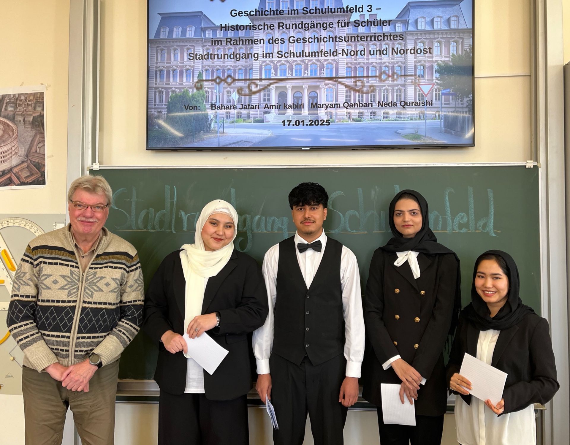 Besonders beeindruckt zeigte sich Schulleiter Klaus Breitsprecher von zwei kooperierenden Schülergruppen, die erstaunlich vielfältige Spuren der Geschichte im Schulumfeld in Form kombinierbarer Stadtrundgängen zusammengeführt hatten: „Die jungen Leute, von denen die meisten erst über die spezielle Vorbereitungsklasse 11s in die Abiturstufe gelangt sind und zum Teil noch gar nicht so lange in Deutschland leben, nehmen mich heute mit auf einen spannenden Ausflug und erklären mir die Geschichte Gothas – ich habe großen Respekt vor dieser tollen Leistung!“