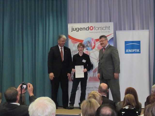 Nachdem sich Tobias Machts (A12) und Chris Machts (7d) im Regionalfinale durch Siege in ihren Kategorien qualifizieren konnten, nahmen sie 22. und 23. März 2012 unter dem Motto „Uns gefällt was Du im Kopf hast“ am Landesfinale des Thüringer Landeswettbewerbs „Jugend forscht“ in der Fachhochschule Jena teil. Insgesamt hatten sich 102 Jugendliche mit 51 Projektarbeiten für das Landesfinale qualifiziert. Mit seiner Arbeit über Chamäleons gewann Tobias den 2. Platz in der Kategorie Biologie und den Sonderpreis Forschung. Chris erreichte im Wettbewerb der Arbeitswelten mit seiner Erforschung des Brandverhaltens einiger Kinderzimmergegenstände den 3. Platz. Herzlichen Glückwunsch!