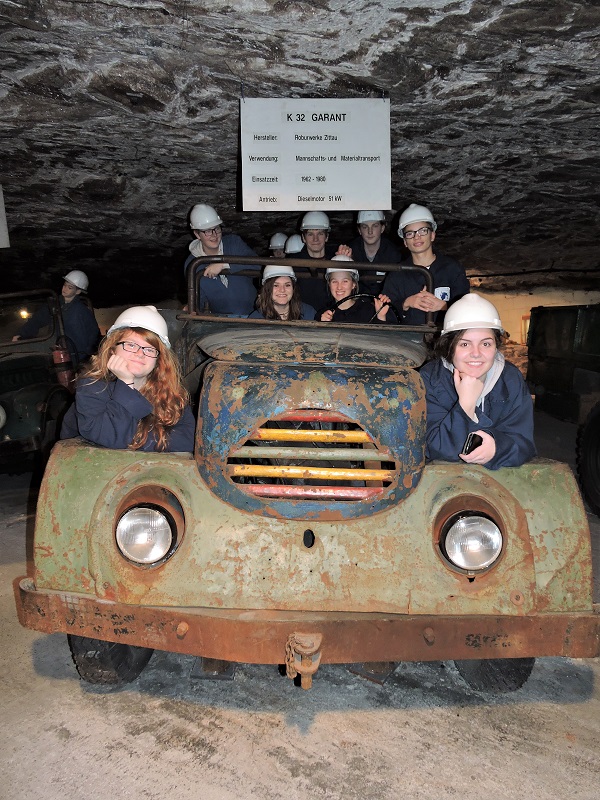 Tief hinab in die Erde ging es in der letzten Schulwoche vor den Ferien für die 10d der KGS Herzog Ernst, um den Gipfel des Erfolgs zu genießen: Im Schuljahr 2016/17 hatten die Schüler beim Nichtraucherwettbewerb „Be smart – Don’t start“ eine Exkursion ins Kalibergwerk Merkers gewonnen. Dieser Preis wurde nun eingelöst. Bergmann Rainer Leser nahm die jungen Leute mit auf eine vielfältige Reise in die Geschichte der Erde und die Welt der Gegenwart. Wie entstand Salz? Wozu wird es genutzt? Wie wird es gewonnen? Was geschieht mit dem Abraum? … Die Kristallgrotte wurde bestaunt und Bergbautechnik untersucht. Die freiwilligen Feuerwehrleute unter den Schülern konnten sich mit Leser über Brandschutzfragen austauschen. Historisch wurde es im Goldraum, wo bei Kriegsende die gesamten Gold- und Devisenbestände der Reichsbank und Kunstwerke von unermesslichem Wert eingelagert waren. Großen Eindruck machte die Lasershow im Großbunker, den meisten Spaß die Fahrt auf dem LKW. Mit Schwung geht es also ins neue Jahr. Und dass sich die Klasse auch dieses Jahr wieder bei „Be smart“ beteiligt, steht außer Frage.
