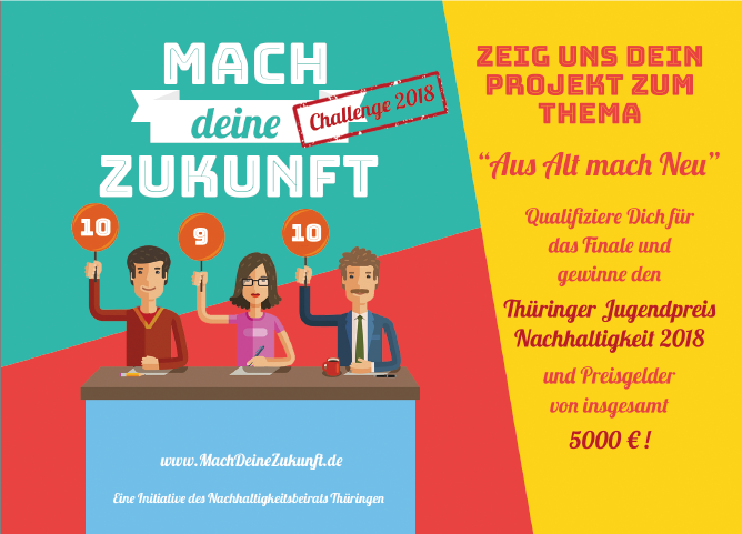 Aufgefordert sind Thüringer Schülerinnen und Schüler sowie junge Erwachsene (im Alter zw. 13 u. max. 25 Jahren), sich mit einem „Aus Alt mach Neu“-Projekt zu bewerben. Gemeint sind Projekte, bei denen aus Altmaterialien, die eigentlich schon für die Entsorgung gedacht waren, etwas Neues entstanden ist.