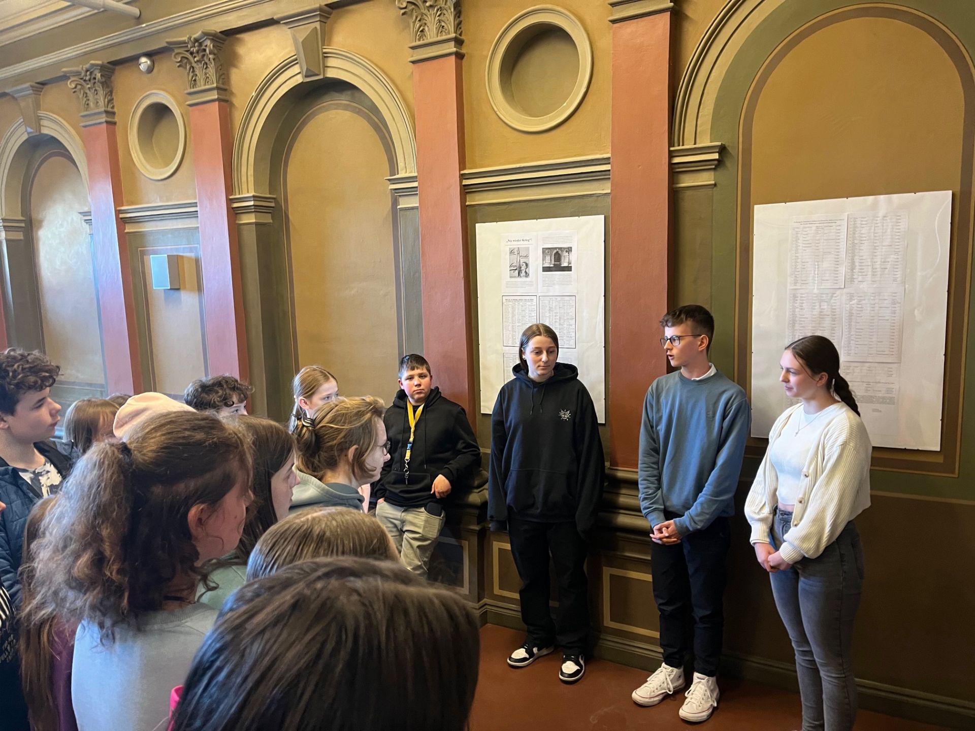 Täglich kann man in den Medien schreckliche Meldungen über bewaffnete Konflikte in der Welt lesen, hören oder sehen, bei denen Menschen ums Leben kommen. Der zweite Jahrestag des Angriffs Russlands auf die Ukraine war Anlass für die Zwölftklässler Eva Bellmann, Natalia Grudzinska und Florian Ruck einen Gedenkort für die Gefallenen der Weltkriege in der Schule einzurichten und den Erhalt des Friedens überall auf der Welt anzumahnen. In Abstimmung mit der Schülervertretung und der Schulleitung gestalteten sie eine kleine Gedenkveranstaltung, in deren Rahmen zwei Schautafeln mit den Namen der Toten enthüllt wurden.