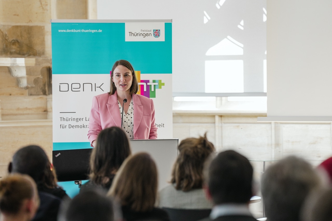 Im Collegium Maius in Erfurt zeichnete Sozialministerin Katharina Schenk im Namen des Landesprogramms „Thüringen denk bunt“ insgesamt sieben Initiativen und Persönlichkeiten aus, die sich mit großem Engagement für Demokratie, Menschenrechte und gesellschaftlichen Zusammenhalt in Thüringen einsetzen.
