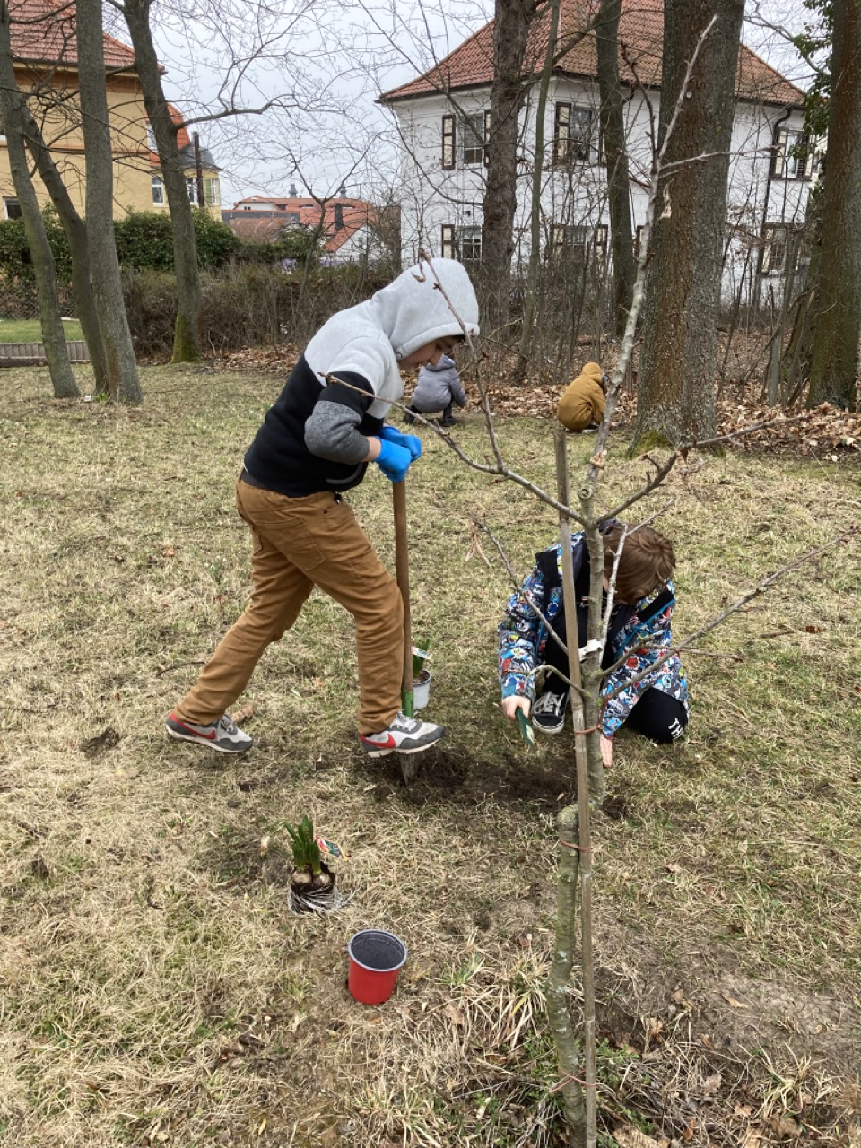 Die Klasse 5b hat sich Mitte März im Garten der Herzog-Ernst-Schule auf die Suche nach Frühjahrsblühern gemacht und bedauerlicherweise nur Schneeglöckchen und eine kleine Gruppe Winterlinge gefunden. So entstand der Wunsch ein Pflanzprojekt durchzuführen.