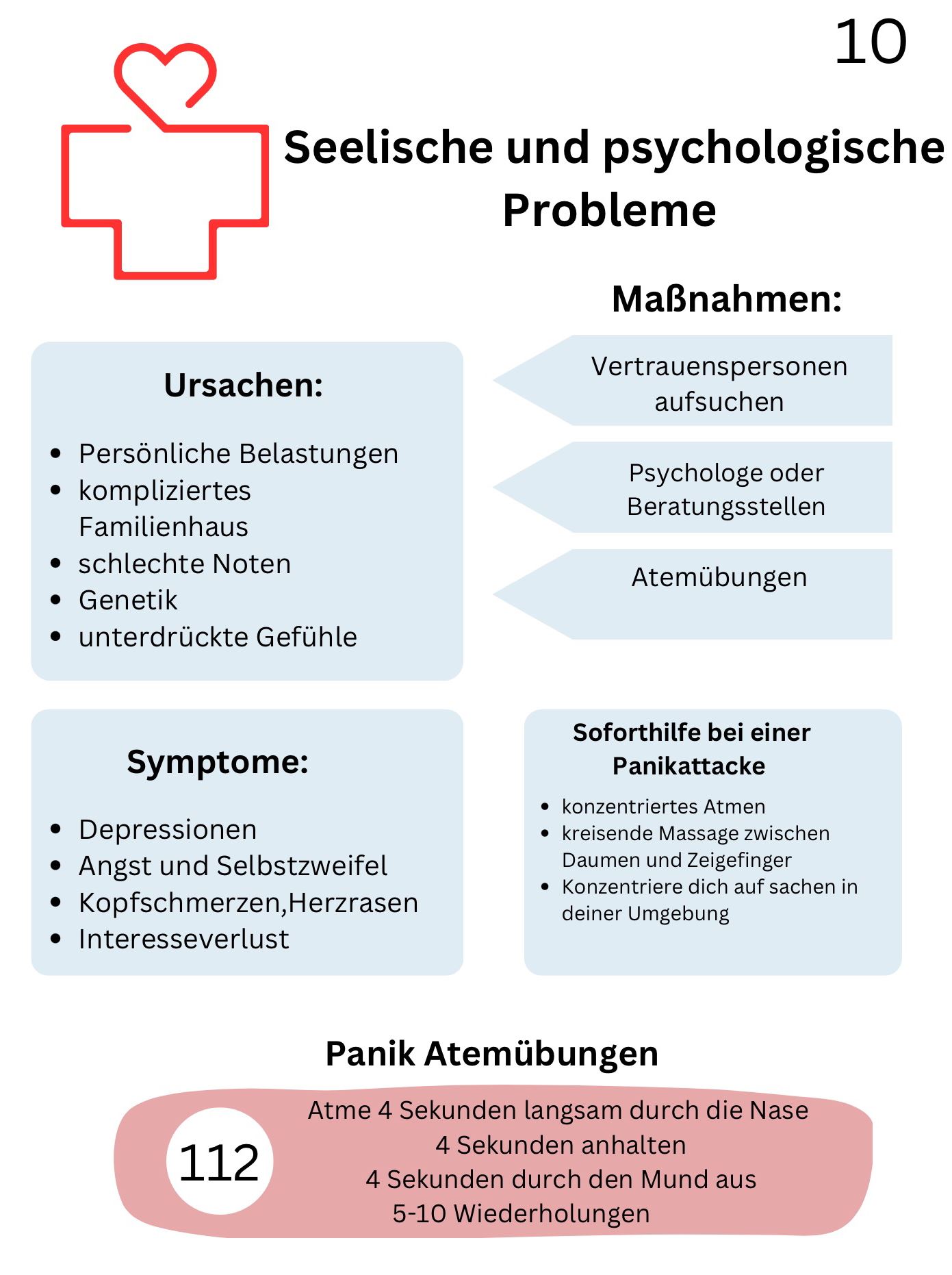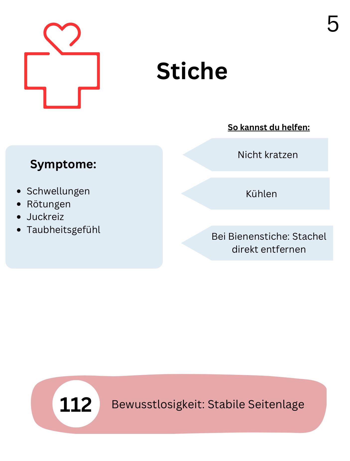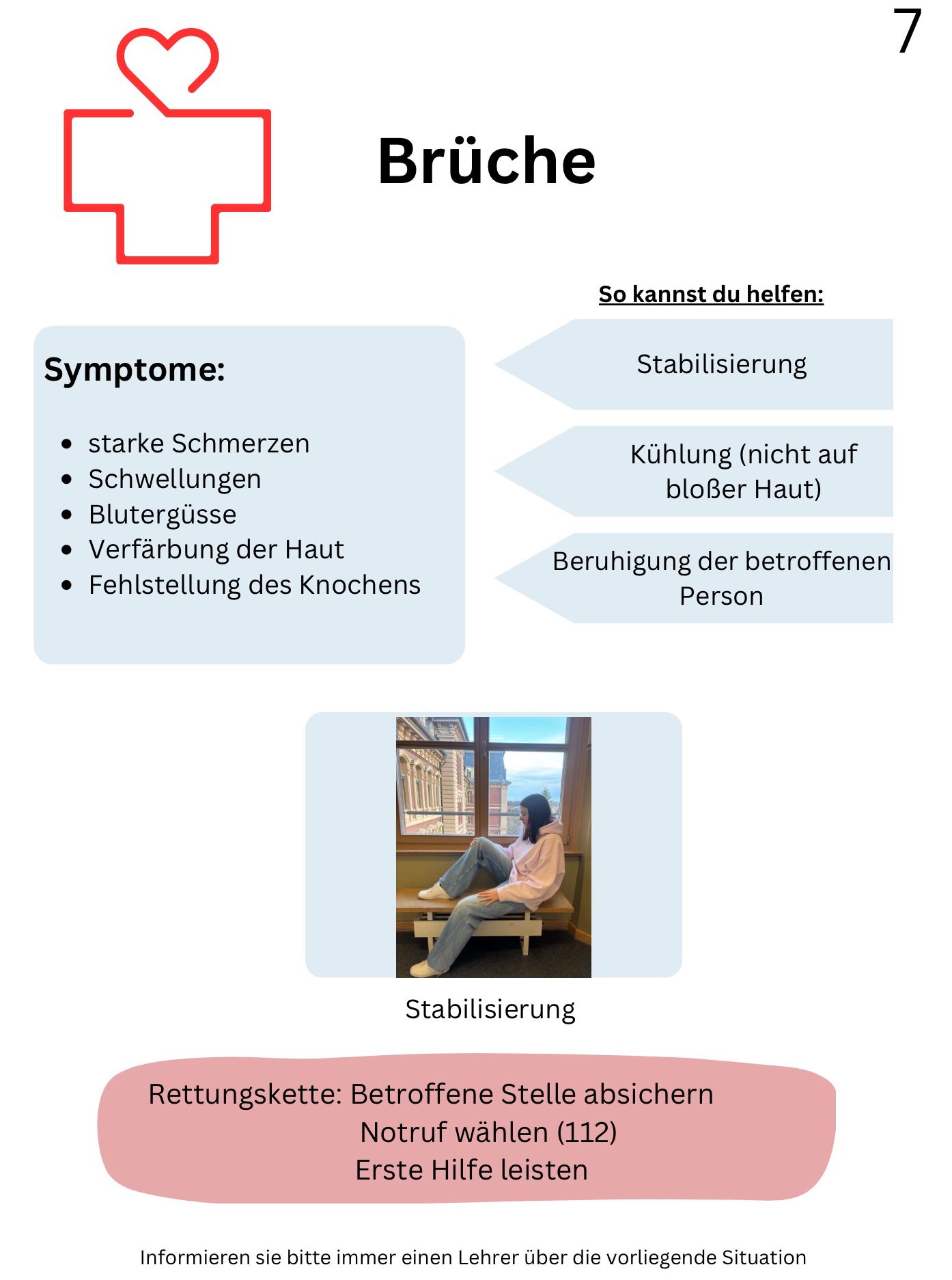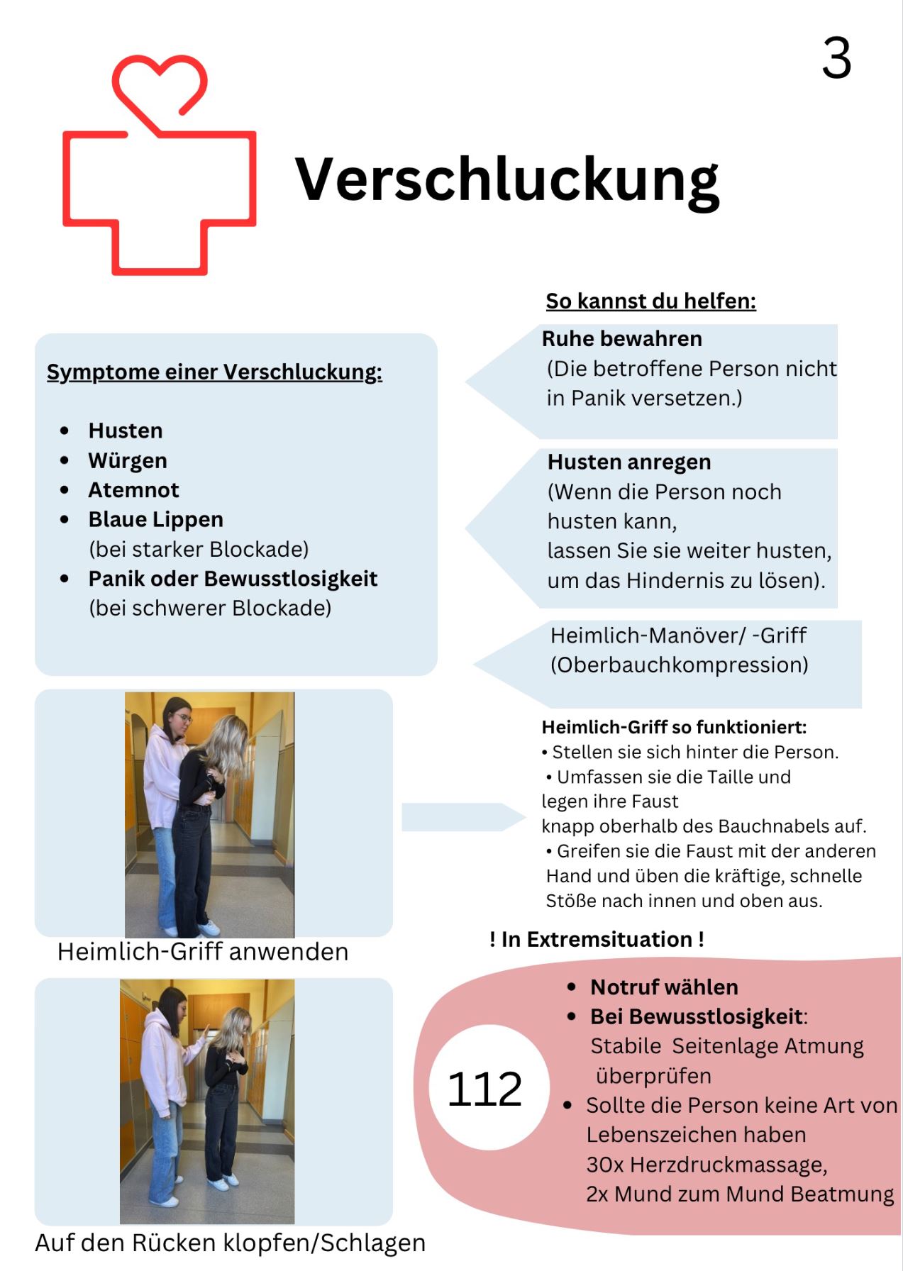 Im Fokus standen typische Notfälle, die im Schulalltag auftreten können. Auf informativen und übersichtlich gestalteten Kärtchen haben die Projektteilnehmer lebenswichtige Erste-Hilfe-Maßnahmen zu verschiedenen Themen aufbereitet. Dazu gehören: