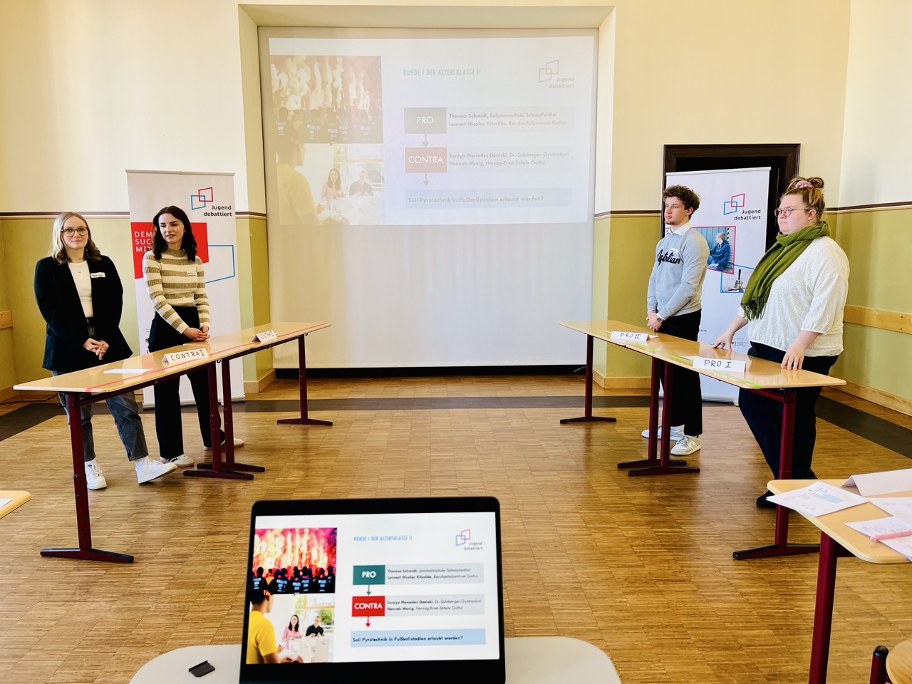 Teilgenommen haben Schülerinnen und Schüler der Salzmannschule in Schnepfenthal, des Berufsschulzentrums Gotha West, der Herzog-Ernst-Schule in Gotha sowie des Dr.-Sulzberger-Gymnasiums in Bad Salzungen. In zwei Altersklassen wurden kontroverse Themen diskutiert: