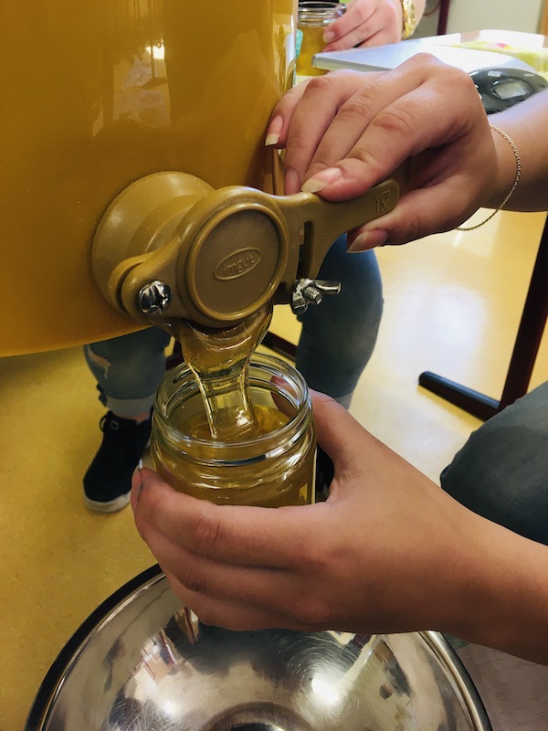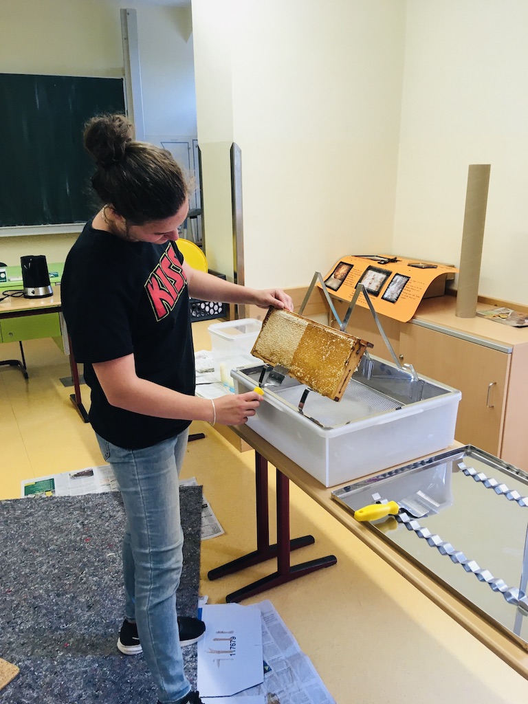 Am ersten Ferientag war es soweit, zusammen mit Michelle Sandow, Aliya Bauer, Daniel Radayev, Constantin Gabriel, Eric Messerschmidt und Paul Kraußer konnten Herr Wiemer und Herr Schmidt endlich die neue Honigschleuder einweihen. Ein herzliches Dankeschön sei an dieser Stelle an Herrn Seiring gerichtet, der uns bei diesem Vorhaben unterstützt hat. Gemeinsam haben wir Honigwaben entdeckelt, den Wassergehalt im Honig bestimmt, den Honig aus den Waben geschleudert, in Gläser abgefüllt und diese etikettiert. Natürlich wurde der Honig auch verkostet. Er schmeckt super lecker. Aber davon sollte man sich lieber selbst überzeugen. Die AG „BEE Ernst“ informiert rechtzeitig über den Verkauf des Honigs.