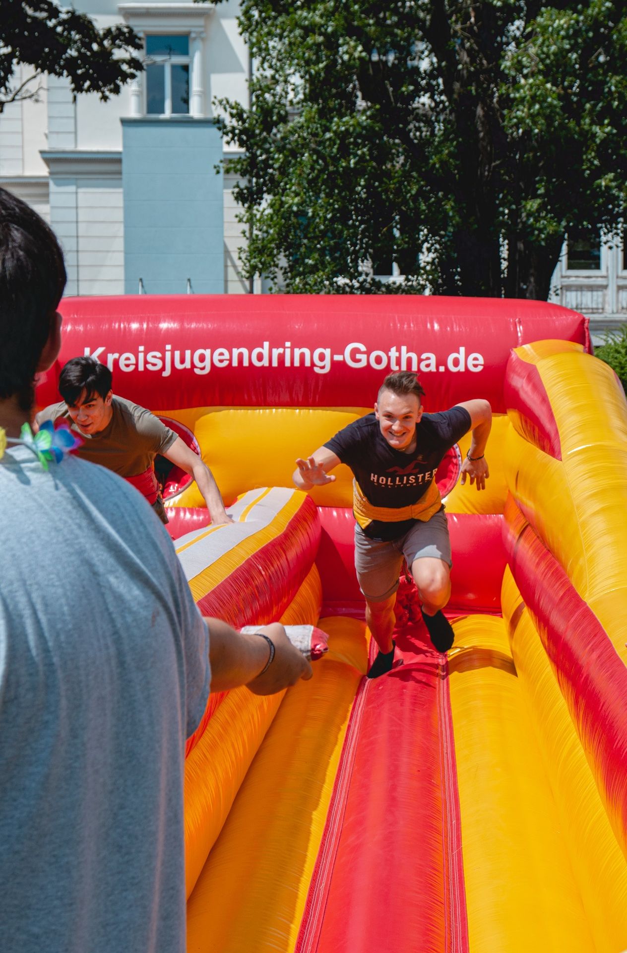 Bunt und voller Menschen war der Schulhof der Kooperativen Gesamtschule „Herzog Ernst“ am sonnigen Freitagnachmittag. Schüler, Eltern und Gäste feierten ihr erstes gemeinsames Sommerfest. Einem Aufruf der Schülerversammlung folgend, stellten die Klassen ein großes Aufgebot an eigenen Ständen auf die Beine. Einfach der Nase nach fand man alles, was zu einem gelungenen Nachmittag beitragen kann: Bratwürste, Burger, Hot Dogs, selbstgebackener Kuchen und Kekse sowie gesunde Obstspieße, außerdem zur Erfrischung Cocktails und kalte Getränke. Auch die Unterhaltung kam nicht zu kurz: Dosenwerfen, ein Flohmarkt, eine Tombola und Kinderschminken wurden angeboten. Jede konnte seinen eigenen Button gestalten und sich als Graffitikünstler ausprobieren. Auf dem an den Schulhof angrenzenden Gelände hatte der Kreisjugendring zwei Hüpfburgen, eine Rollenrutsche und einen Bungeerun aufgebaut. Mitten im bunten Treiben überraschte ein Flashmob, initiiert von den Oberstufenschülern, zu bekannten Partyklassikern. Nach dem Essen und der sportlichen Betätigung konnte man sich bei guten Gesprächen auf dem Schulhof erholen.