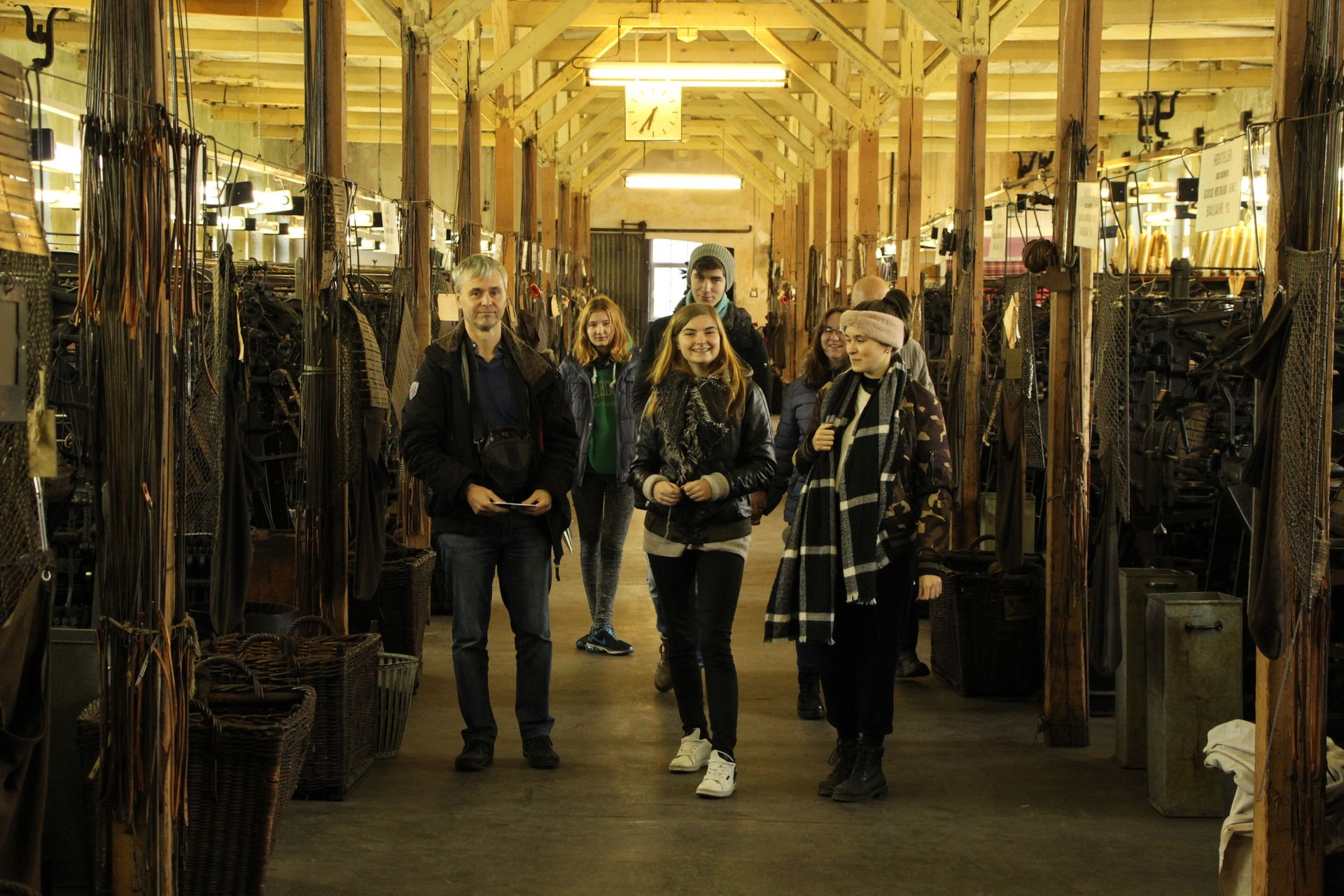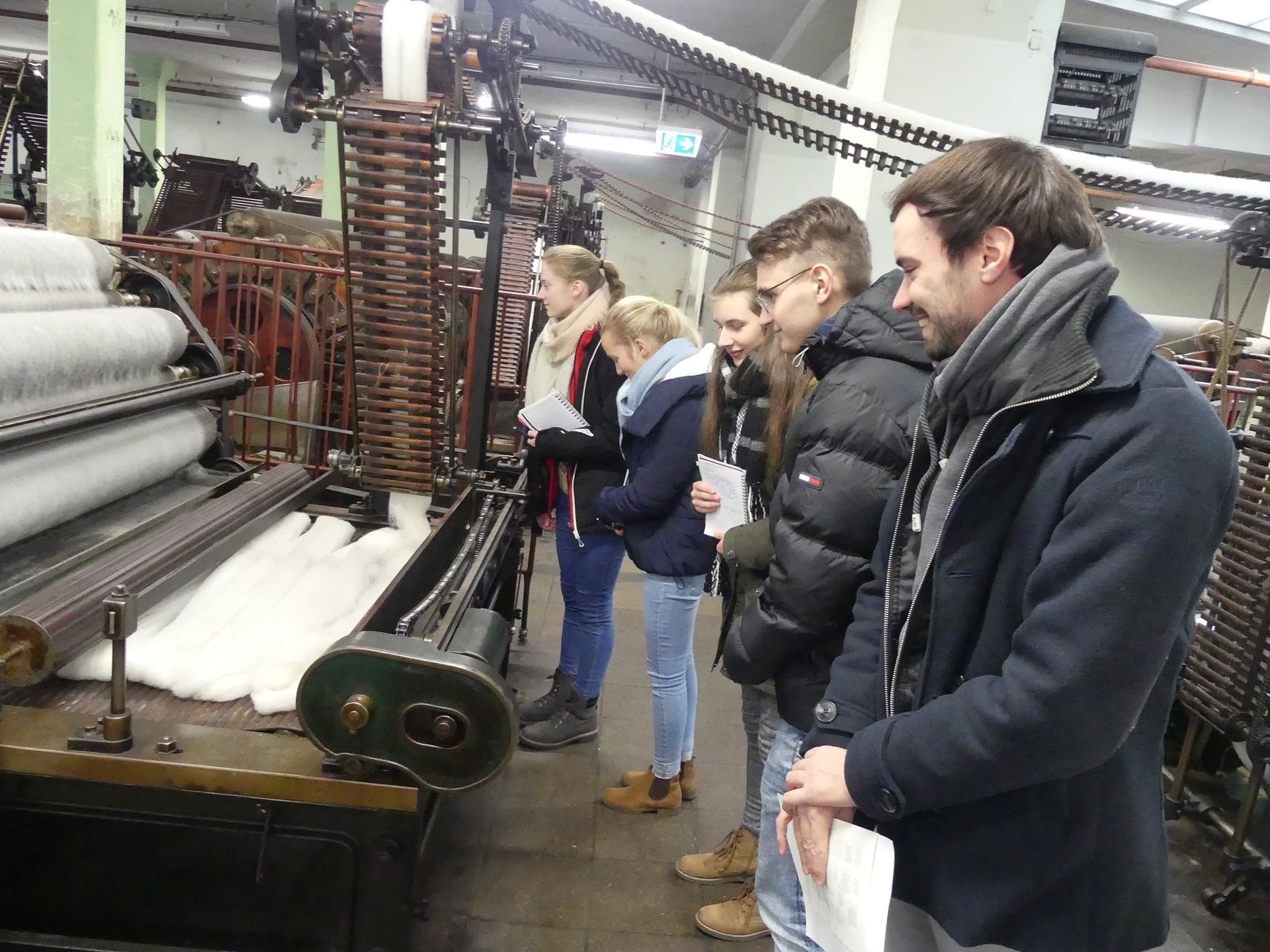 Das Museum in der ehemaligen Tuchfabrik Gebr. Pfau ist ein wahres industriegeschichtliches Schmuckstück und einmalig in Mitteleuropa. Aliya Bauer staunte: „Hier kann man den kompletten Produktionsablauf der Textilherstellung nachvollziehen – Flocken, Krempeln, Spinnen, Zwirnen, Weben, Färben, Walken, Scheren – und vor allem aber die Maschinen in Funktion sehen.“ Letzteres beeindruckte Anne Steinborn besonders: „Der Rhythmus der Maschinen und der Geruch haben etwas Spezielles und Ästhetisches. Man muss für dieses Empfinden aber das Wissen über die katastrophalen Arbeitsbedingungen ausblenden.“ Lange Arbeitszeiten und Kinderarbeit waren früher normal. Außer den Informationen über die Arbeitsprozesse, über die sozialen Verhältnisse und über die Umweltfolgen der Textilproduktion erfuhren die Schüler nebenbei viele kleine Details und Anekdoten: 1903/04 fand in Crimmitschau der größte und längste Streik im Kaiserreich statt. 8000 Menschen waren dabei 22 Wochen im Ausstand. Die Staatsmacht ging mit aller Härte gegen sie vor. Wie aber konnte sie z. B. auf legalem Wege Streikposten vor den betroffenen Betrieben verbieten? Museumspädagogin Marion Kaiser verriet: Man erklärte sie einfach zu Verkehrshindernissen,