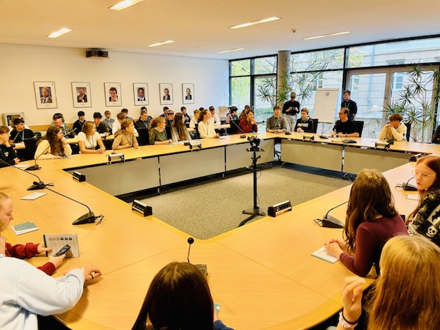 Bei einer Führung durch die Landtagsgebäude und nach einem Besuch des Plenarsaals konnten die Schülerinnen und Schüler zunächst allgemeine Fragen rund um die Organisation des Landtages und die Arbeitsweise eines Abgeordneten stellen. Im Fraktionssaal, einem Ort, den nur selten Besucher besichtigen dürfen, stellte sich Denny Möller dann auch den kleinen und großen Fragen der Schülerinnen und Schüler. Wie gelingt ein Umdenken bei Thema Klimaschutz? Warum haben viele Schulen in Thüringen einen Lehrermangel? Warum steigen die Preise im Supermarkt und was macht die Politik dagegen? Wie beeinflusst uns der aktuelle Konflikt im Nahen Osten und wie soll sich Deutschland hier positionieren?