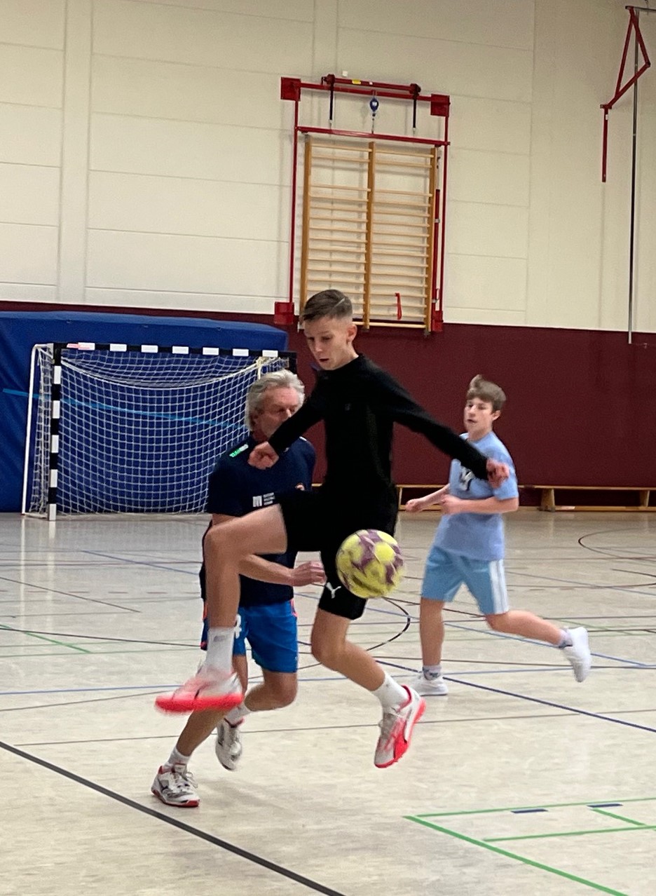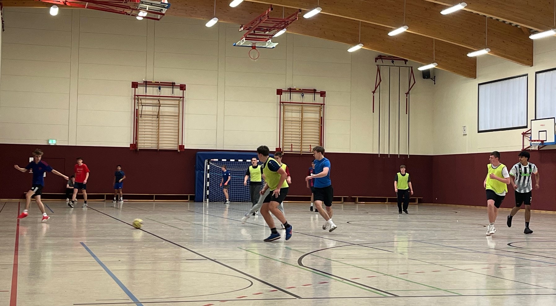 Vier Mannschaften traten gegeneinander an – die U17 als Erstplatzierter bei „Jugend trainiert für Olympia“, die U20 als Drittplatzierter ebenfalls bei diesem Schülerwettbewerb, die Gewinner der KGS-Mini-EM aus der Jahrgangsstufe 10 und der „Budenzauber“, also die Lehrermannschaft. Zwar zahlten die Neuntklässler bezüglich der Ergebnisse ein bisschen Lehrgeld, diese waren aber gegen die Mitschüler nur knapp und sie begeisterten durch sicheres Kombinieren und großen Kampfgeist. Da werden es die künftigen Gegner schwer haben! Auch die Zehner wussten sich zu behaupten. Ihnen gelang auch das erste Tor gegen die Lehrermannschaft mit einem wuchtigen Hammer ins linke Eck durch Lennart Bankau. Auch den Zwölfern gelang gegen die Lehrer ein schön herausgespielter Treffer und sie trotzten diesen sogar ein Unentschieden ab. Nichtsdestotrotz konnten die Ältesten auf dem Parkett den Pokal erfolgreich behaupten.