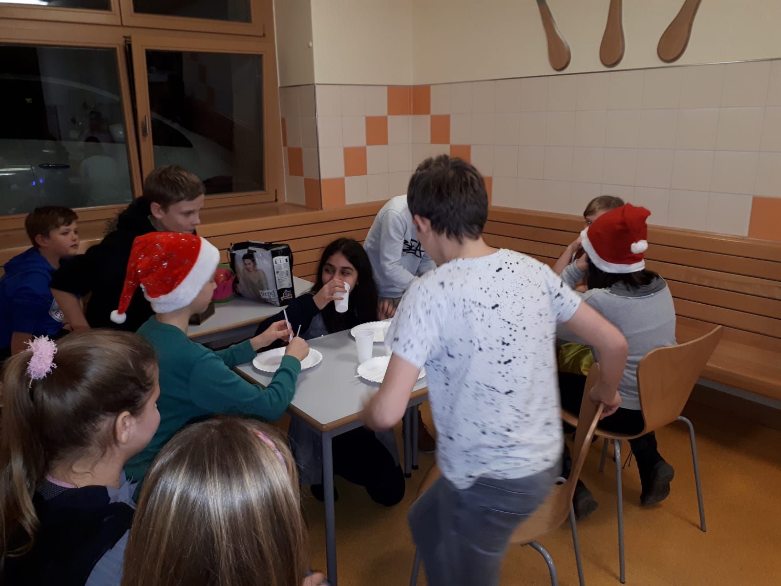 Nachdem wir gebastelt und gebacken haben, führten wir gemeinsam mit unseren Eltern und Lehrern die Weihnachtsfeier durch. Ein Schüler unserer Klasse war der Weihnachtsmann und verteilte die Wichtelgeschenke, die jeder von uns für einen Mitschüler mitgebracht hatte.