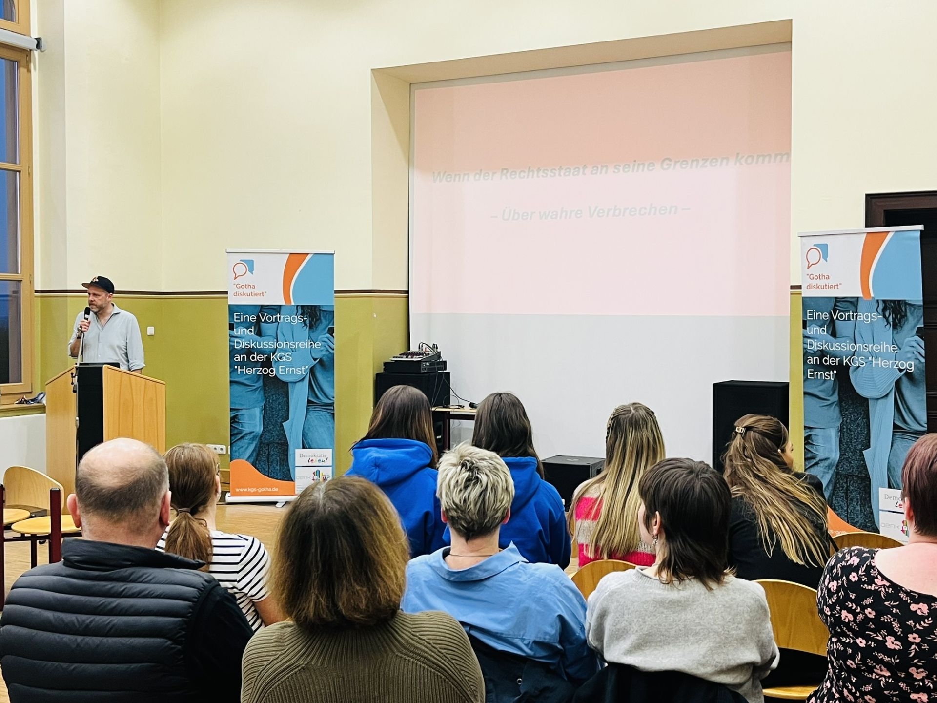 Kurz vor den Osterferien freute sich die Kooperative Gesamtschule „Herzog Ernst“ über einen besonderen Gast: Daniel Müller, Chefredakteur des renommierten True-Crime-Magazins ZEIT Verbrechen, war zu Gast, um mit Schülerinnen und Schülern der Klassenstufen 10 und 12 über die Schattenseiten unserer Gesellschaft und die Grenzen des Rechtsstaats zu sprechen. Unter dem Titel „Wenn der Rechtsstaat an seine Grenzen kommt – Über wahre Verbrechen“ berichtete er in der Reihe „Gotha diskutiert“ von besonders eindrucksvollen Fällen, die ihn in den letzten Jahren als Journalist beschäftigt haben.
