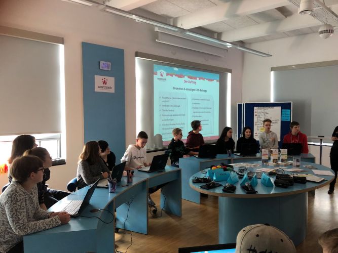 „Thüringer Teenie TV“ lautet der Titel einer Nachrichtensendung, die von Schülern der Klasse 9d am 28.März 2019 in einem Workshop im „Wortreich“ in Bad Hersfeld aufgenommen wurde. Unter Anleitung zweier Mitarbeiterinnen des interaktiven Museums der deutschen Sprache entstand ein 15-minütiger Film, der von Carolin und Mara moderiert und in kleinen Gruppen an verschiedenen Schauplätzen im Museum gedreht wurde. Im Vorfeld erarbeiteten die Schüler innerhalb der Rubriken Sport, Politik, Gesellschaft sowie Klatsch und Tratsch ihre Ideen und ein entsprechendes Storyboard. Mit Mikrofon und Kamera sowie verschiedenen Requisiten gingen die Schüler an die Dreharbeiten für einen jeweils dreiminütigen Beitrag. Es ging um Artikel 13, Mopedverbot für Minderjährige, Extreme Bobbycar Racing und die imaginäre Promifamilie de Raasch. Während die einzelnen Schüler drehten, nahmen die beiden Moderatorinnen ihre Ansagen vor einem Bluescreen im Studio auf. Am Ende der Veranstaltung wurde die zusammengefügte Sendung allen Schülern gezeigt und auf elektronischem Weg zur Verfügung gestellt. Unverkennbar ist dabei die Thüringer Herkunft der Darsteller, überraschend das ein oder andere bislang unentdeckte schauspielerische und kreative Talent.