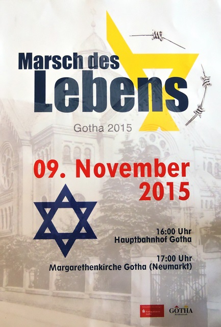 Deshalb auch der Aufruf Yonati Shlezingers, der von Helmut Rieth und von vielen anderen Gothaern vor allem auch an junge Menschen, sich am Marsch der Erinnerung am Montag, dem 9. November 2015, ab 16.00 Uhr ab dem Bahnhofsvorplatz zu beteiligen.