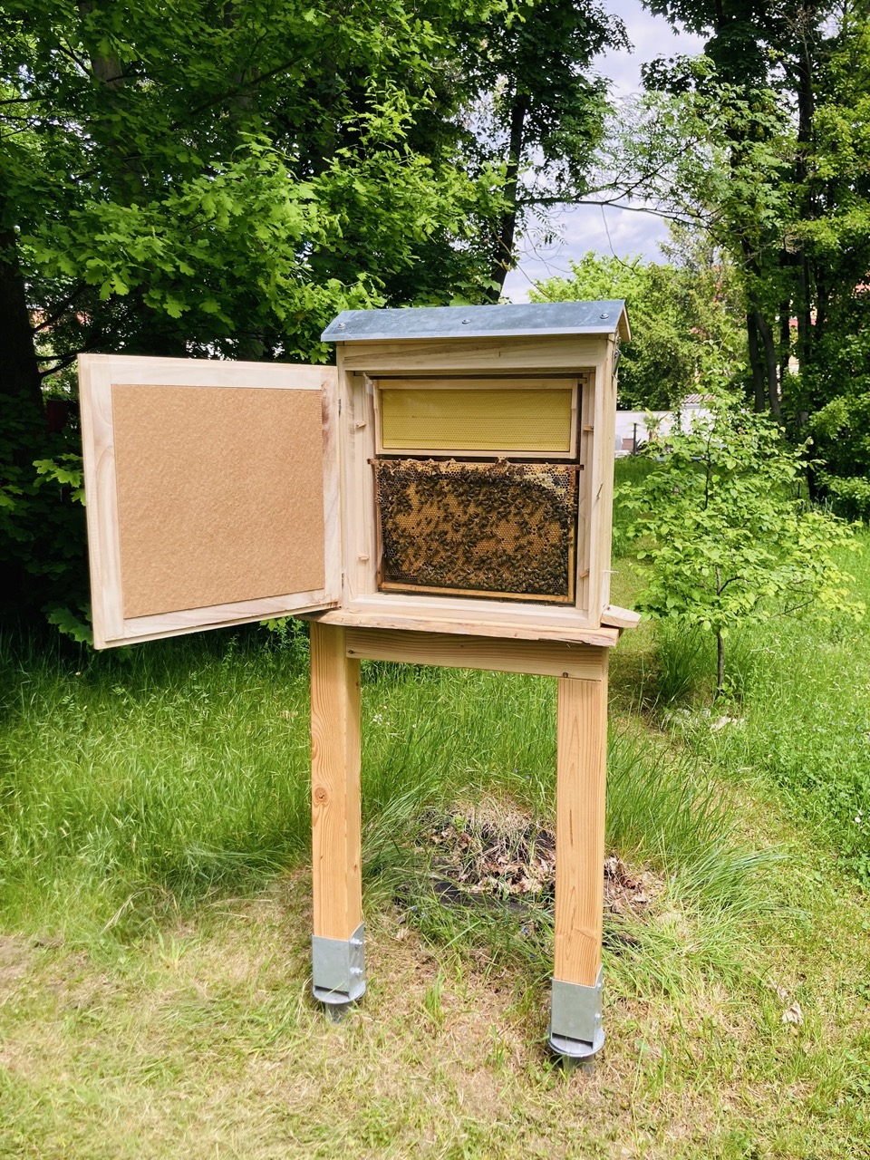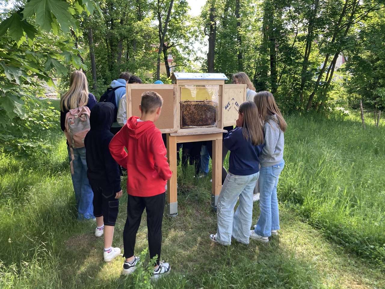 Zum Weltbienentag präsentierten Schülerinnen und Schüler der Imker AG unserer Schule eine Schaubeute am Rand unserer Streuobstwiese. Im letzten Schuljahr hat die Firma Durable aus Gotha der Imker AG 1500 Euro gespendet. Von dem Geld konnten die AG Mitglieder u.a. eine Exkursion ins Bienenmuseum nach Oberweimar finanzieren, eine kleine Drechselmaschine und die Schaubeute kaufen. Kimberly Arlt aus der Klasse 10a hat die Gestaltung der Schaubeute übernommen. Von Mai bis August wird die Schaubeute nun mit Bienen besetzt sein und ermöglicht unseren Schülern einen Einblick in den Bienenstaat. Die Königin lässt sich in diesem Jahr an ihrem blauen Opalith-Plättchen auf dem Rücken leicht finden.