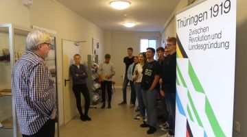 Eine Gelegenheit zur intensiven Beschäftigung mit der Entstehung und Entwicklung unseres Bundeslandes bot sich für den eA-Kurs Geschichte 12 durch den Besuch der Sonderausstellung „Thüringen 1919“ im